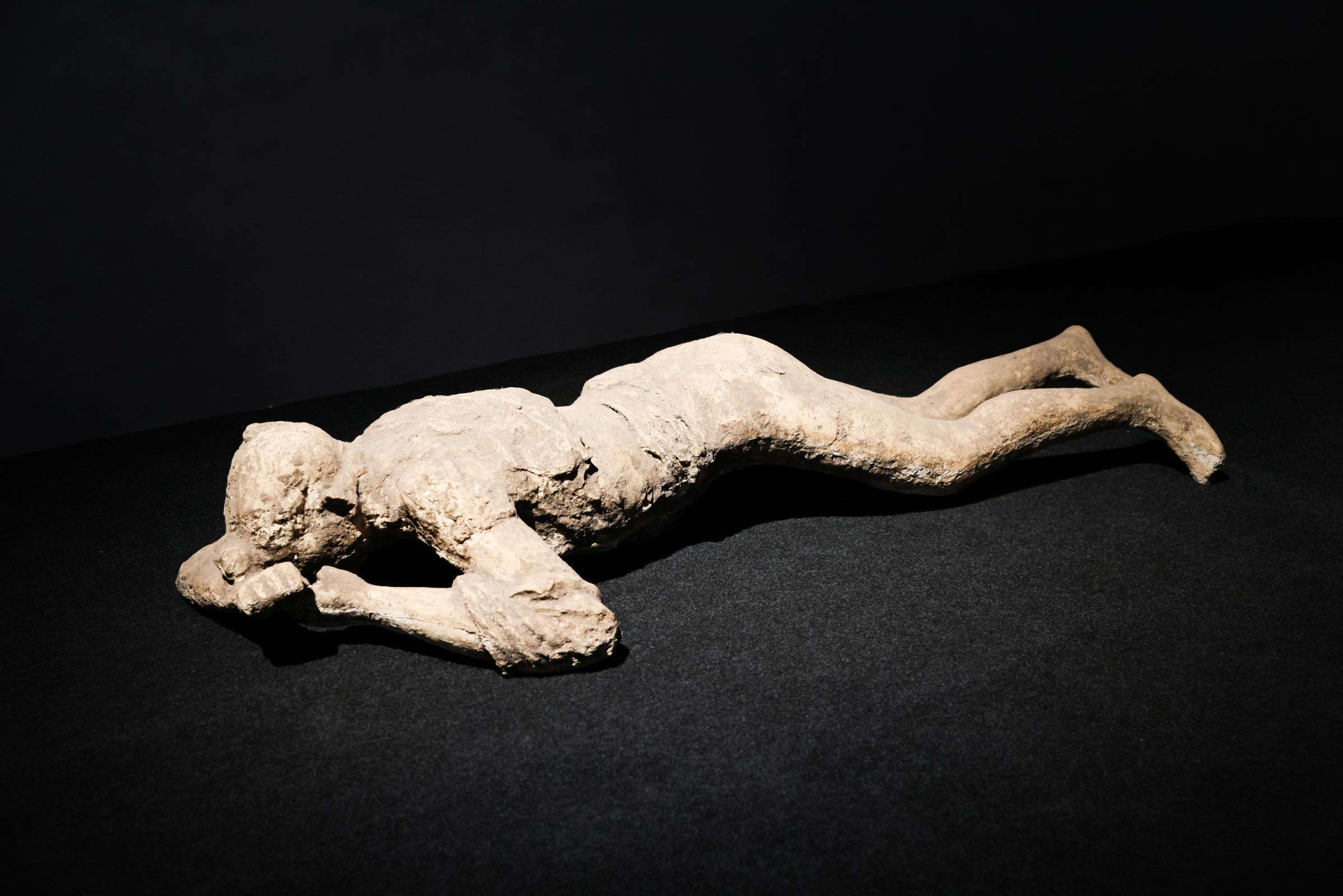 展厅展出了3件石膏铸像,分别是一对成年遇难者、一只家犬及一位少女,均为21世纪在“大庞贝计划”框架下制作的高精度研究性复制品。它们并非对早期石膏铸像的简单模仿,而是基于材料分析、骨骼学研究和三维成像等技术手段,对19世纪末至20世纪初发掘的原型进行科学重审与再现的成果。它们既重构了公元79年那个灾难瞬间的众生图景,也揭示了人类认知与保护文化遗产的科学进路。