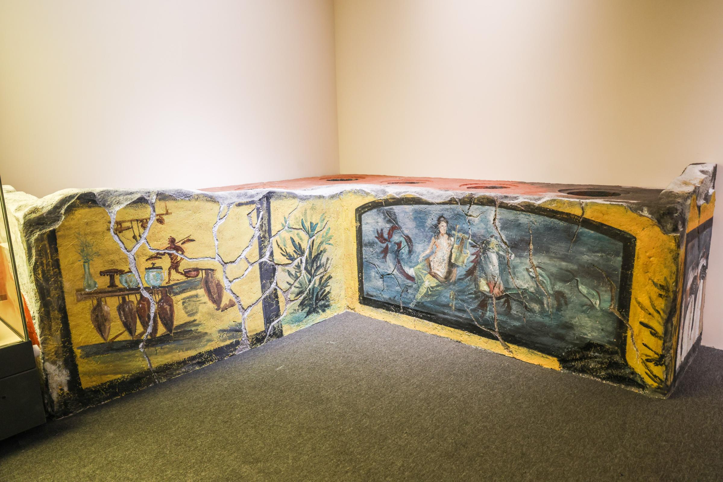 L形的吧台表面装饰着色彩艳丽的绘画。一侧朝着店内,画的是希腊神话中的海仙女涅瑞伊得斯骑在海马上;另一侧算是“广告位”,朝店外,画的是一个抽象“打工人”,在锅碗盆罐间忙碌。台面上有类似灶眼的孔洞。待晾干的陶罐和一只带有可拆卸铁提梁的小桶摆在一边。说明牌补充了故事的细节:店内出土了蚕豆和禽类骨骼等食物痕迹,显示这里曾售卖热饮和热食。