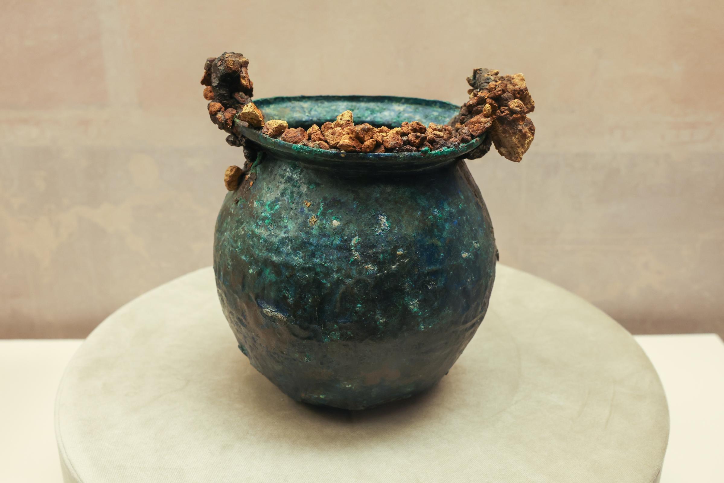 火山爆发时,小桶被慌乱躲避的人群掀翻,滚落到角落里,最终深埋地下。直到2019年,它重现天日,铁质的提梁与火山灰发生反应,凝结了一层物质,仿佛永不磨灭的“火山记忆”。