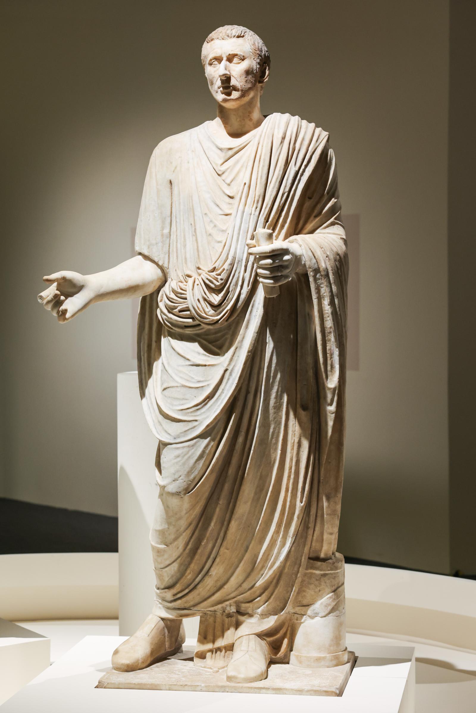 雕塑是展览的重头戏之一。身着托加袍的市政官雕像是首展文物之一。在罗马社会中,托加是公民身份与公共权力的标志性服饰,通常在政治、司法或宗教场合穿着。